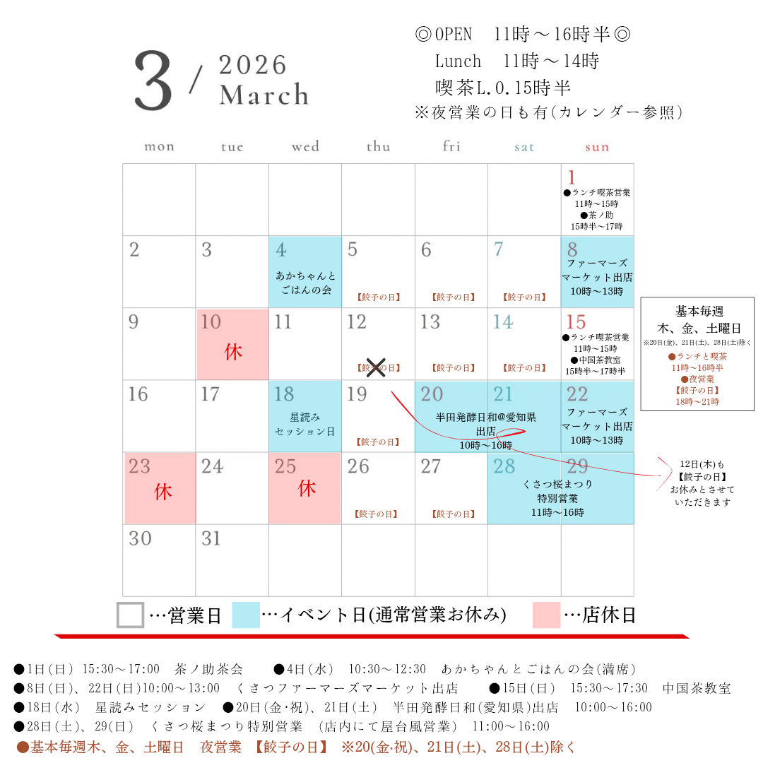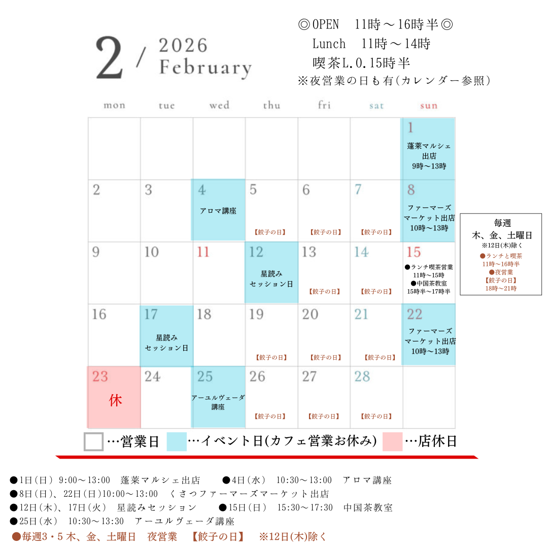 不定休(カレンダーをご覧ください)
